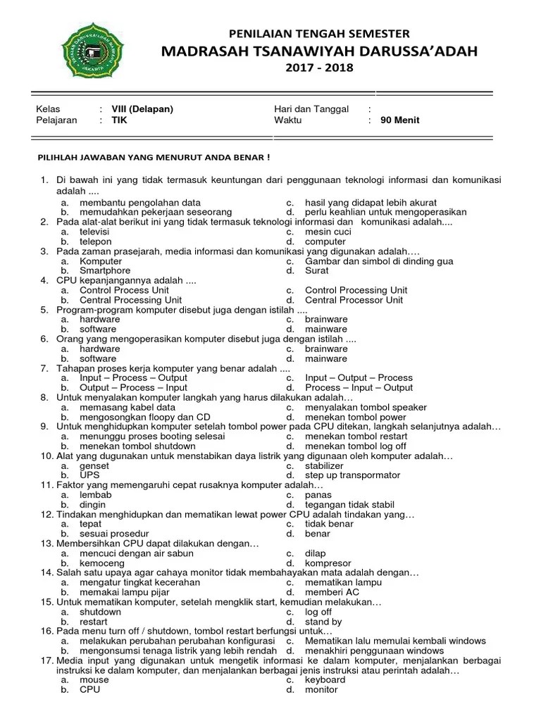 Pada kesempatan ini, kami berbagi soal pat tik kelas 10 tingkat sma/ma lengkap kunci jawabannya. 60 + contoh soal pts tik kelas 7 semester 2 dan kunci jawaban. Pilihlah satu jawaban yang benar, dengan memberikan tanda silang (x) pada huruf a, b, atau c! Kumpulan soal uas tik kelas 1 sd semester 2. 12 hours ago delete reply block.